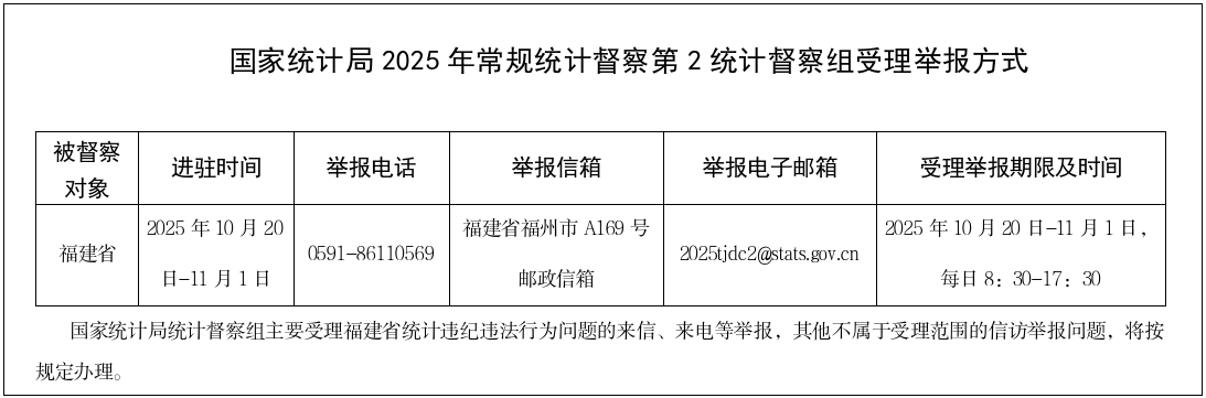 為深入貫徹落實(shí)習(xí)近平總書(shū)記關(guān)于統(tǒng)計(jì)工作的重要講話(huà)和重要指示批示精神,根據(jù)黨中央和國(guó)務(wù)院授權(quán),國(guó)家統(tǒng)計(jì)局2025年常規(guī)統(tǒng)計(jì)督察第2統(tǒng)計(jì)督察組日前進(jìn)駐福建省開(kāi)展統(tǒng)計(jì)督察工作,實(shí)地督察時(shí)間13天左右。